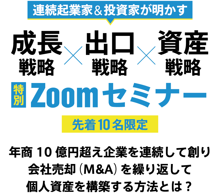 今回の特別セミナーでは、そのことを踏まえて、会社の成長戦略・会社の出口戦略・個人の資産戦略という3つのテーマで、その全貌を公開していきます。
